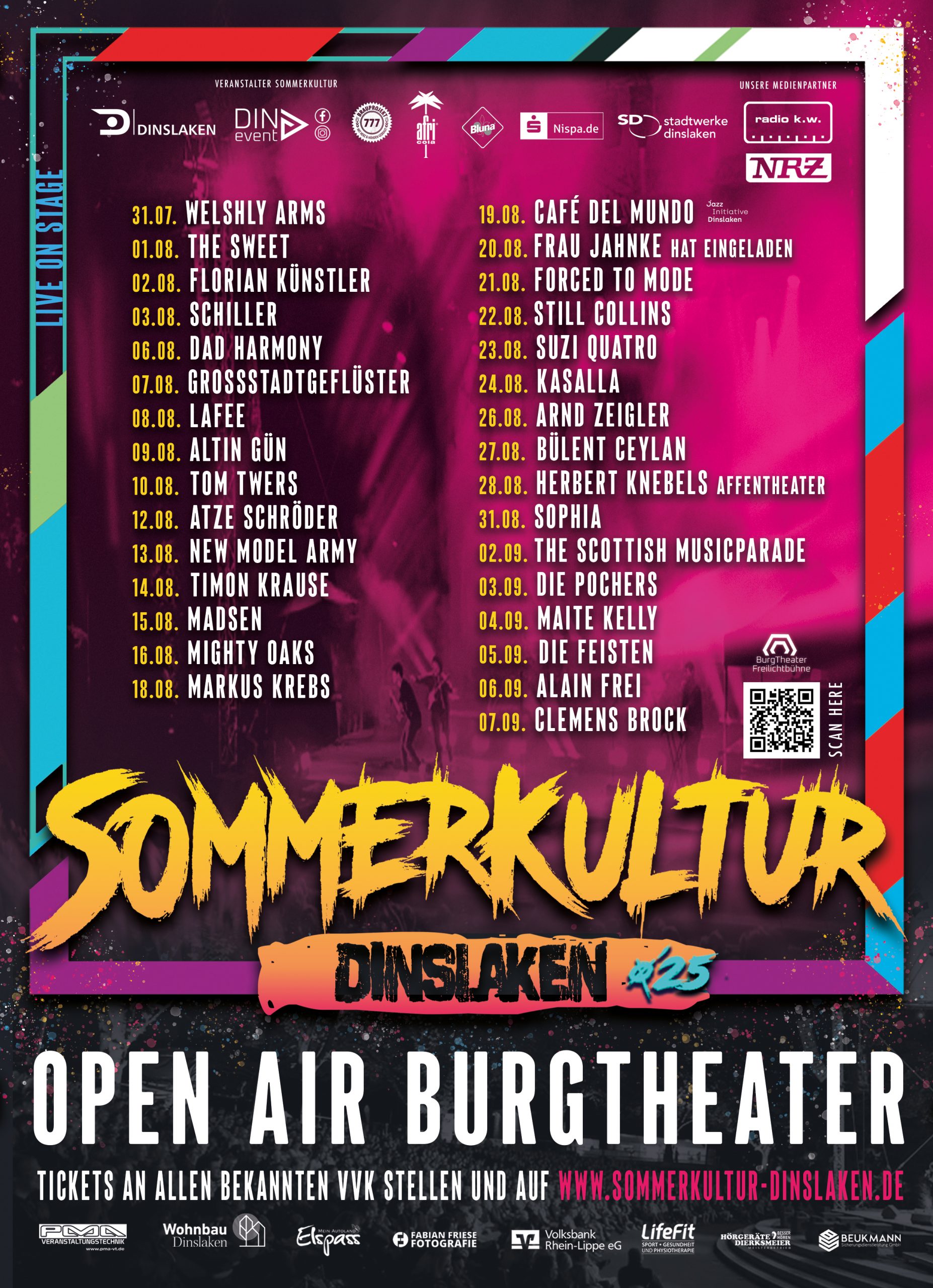 Sommerkultur ist die sommerliche „Dachmarke“ der DIN-EVENT GmbH und wurde erstmalig 2020 in Dinslaken umgesetzt. Die Veranstaltungsreihe im Burgtheater bietet Comedy, Rock- und Popmusik, Jazz und Klassik, die seitdem jährlich unsere Besucher aus ganz Deutschland begeistert. Das Burgtheater, 1934 errichtet und im stimmungsvollen Verbund zur mittelalterlichen Burg und der Kathrin-Türks-Halle,